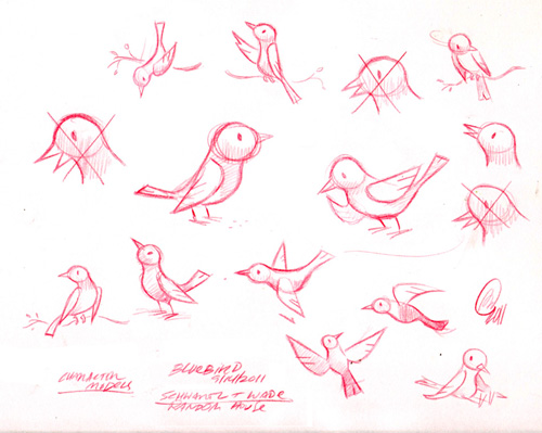 While the bluebird would appear relatively small in most scenes throughout the book, Staake knew that it would have to evoke the right level of emotion from beginning to end of the story. Staake created a series of character studies showing the bluebird in a variety of poses, but he viewed these characterizations to be wrong. "My first drawings of the bluebird just didn't sit right with me", he said. "The original bluebird simply didn't seem to have the personality I needed to convey."