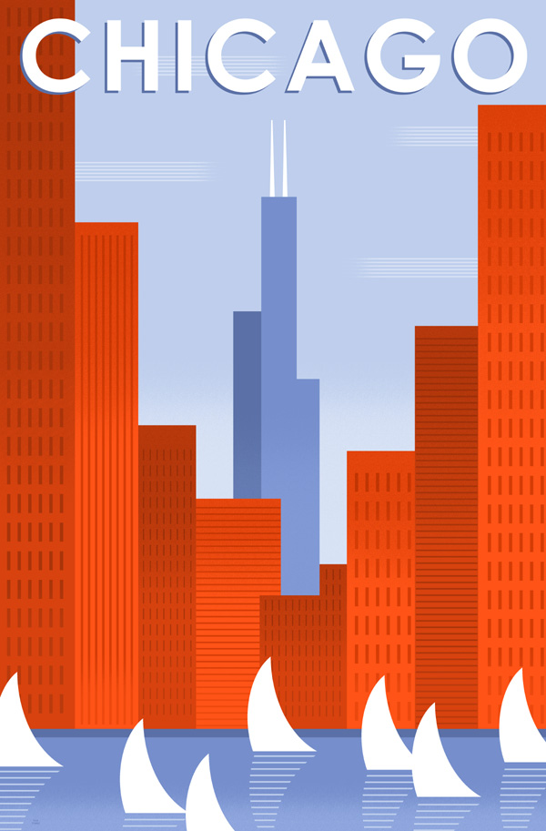 Description: Digital illustration by Bob Staake depicting a stylized rendering of the Chicago skyline and Lake Michigan waterfront.