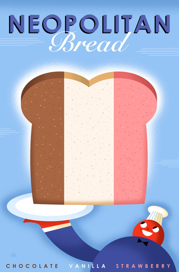 Description: Faux advertising poster for 'Neopolitan Bread' rendered in classic style of Mid-20th Century European advertising signage